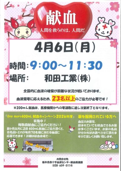 - 2026/04/06 第10回 献血活動を行いました。 2026年04月06日/ 和田工業の駐車場で献血活動を行いまし…