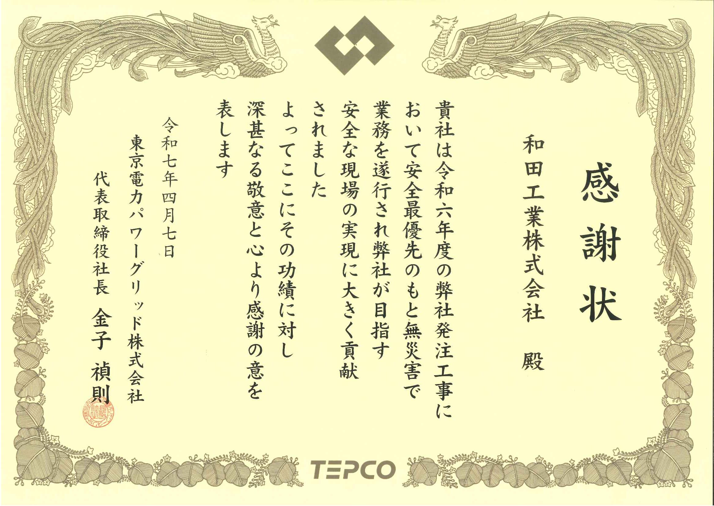 - 東電パワーグリット株式会社 表彰 2025年04月07日/ 東電パワーグリット株式会社様から感謝状を頂きました。…